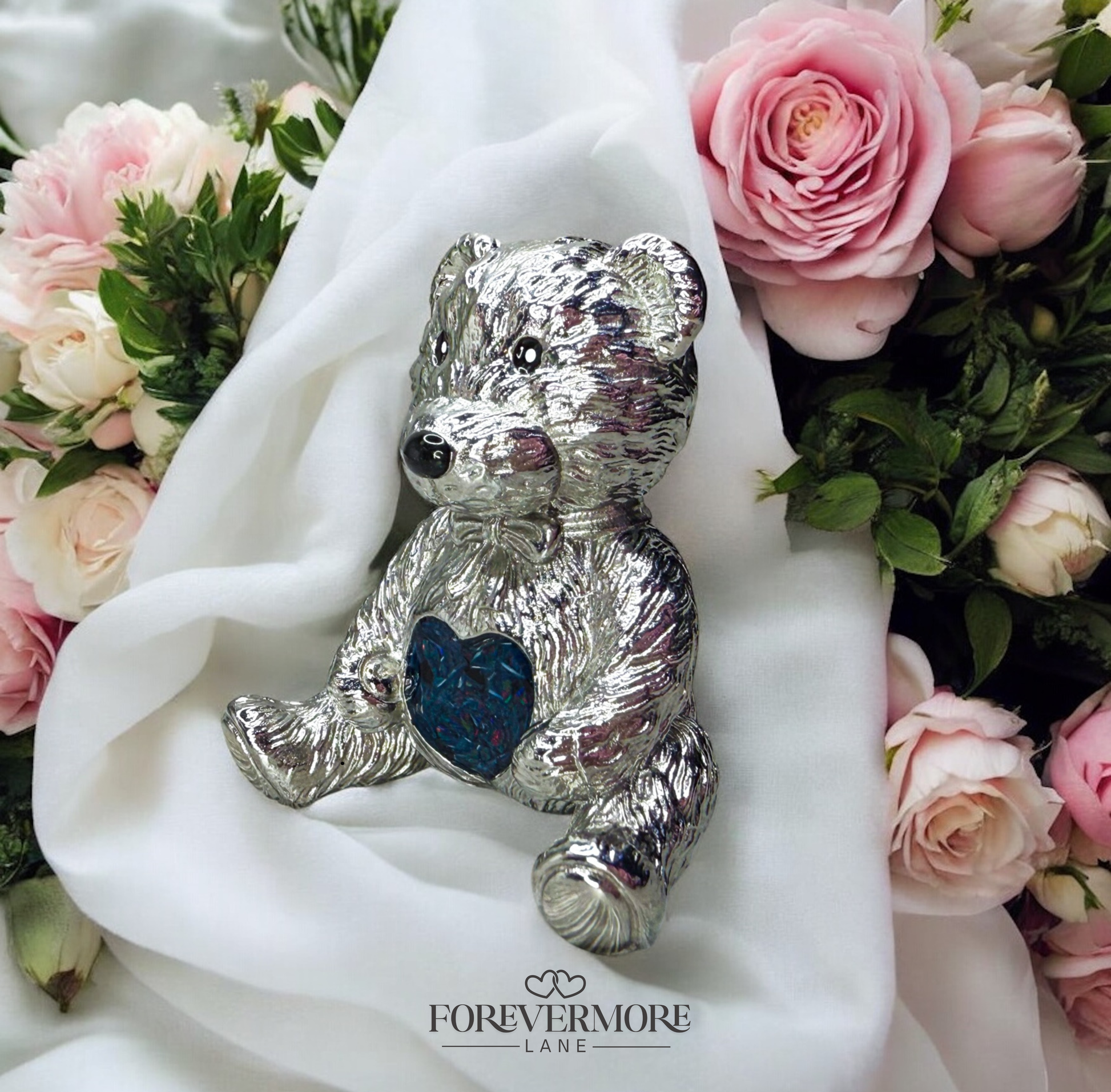 Our Bonnie Bear Ornament is a finely crafted stainless steel memorial teddy bear, approximately 5cm tall and weighing 168g, designed to hold cherished inclusions in its recessed compartment. Its substantial weight and durable material ensure lasting remembrance, making it a meaningful keepsake for honoring loved ones.