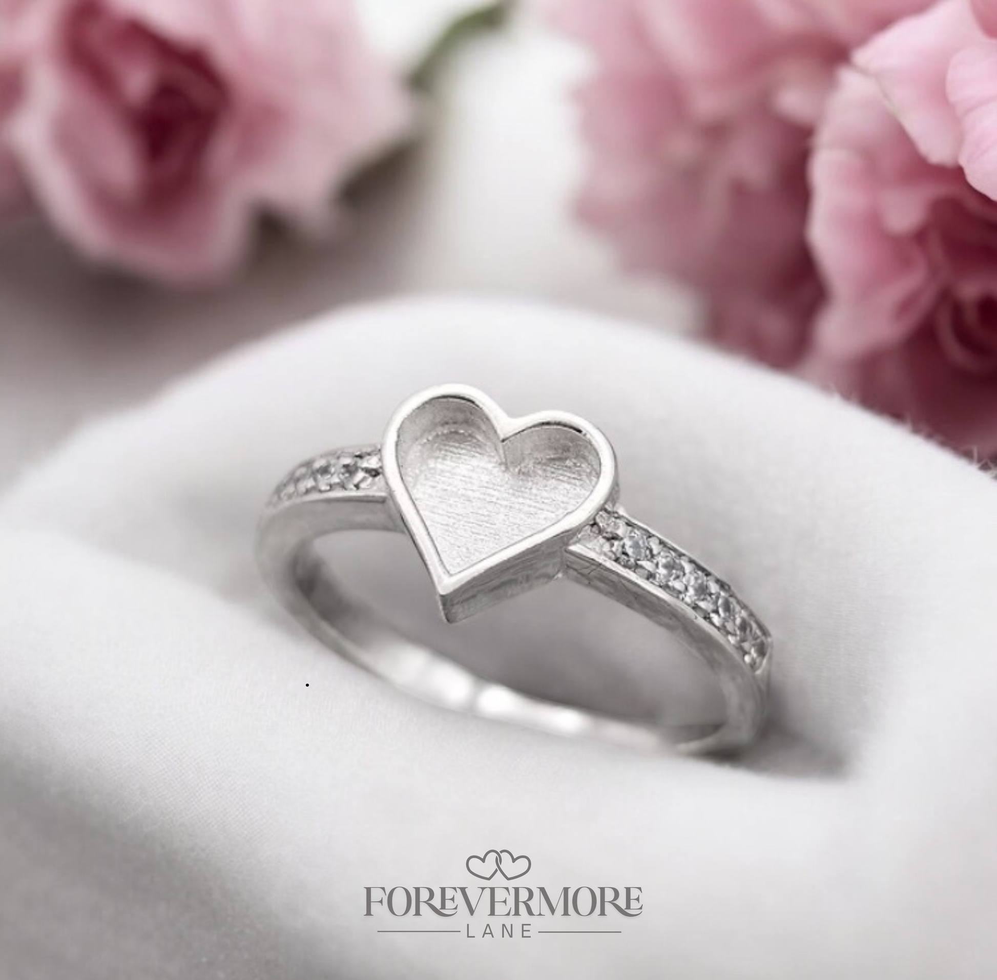 The Zara Heart Ring features a delicate sterling silver design centered around a charming heart accented with cubic zirconia stones that gracefully extend down the shoulders. This elegant piece offers a meaningful tribute, combining subtle sparkle with refined craftsmanship, making it a thoughtful addition for memorial keepsakes or to honor cherished memories.
